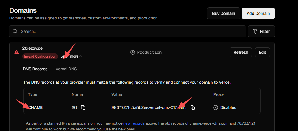 这个时候已经可以访问了,不过没有自定义域名,我们需要将一个自定义域名通过CNAME的方式,先解析到Vercel,基本秒解析